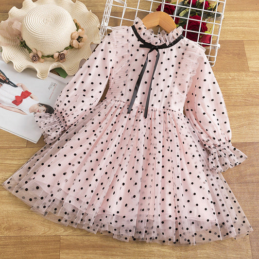 Wiosenna dziewczęca sukienka w kropki z długim rękawem