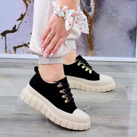 CZARNE ZAMSZOWE TRAMPKI DAMSKIE NA GRUBEJ PODESZWIE