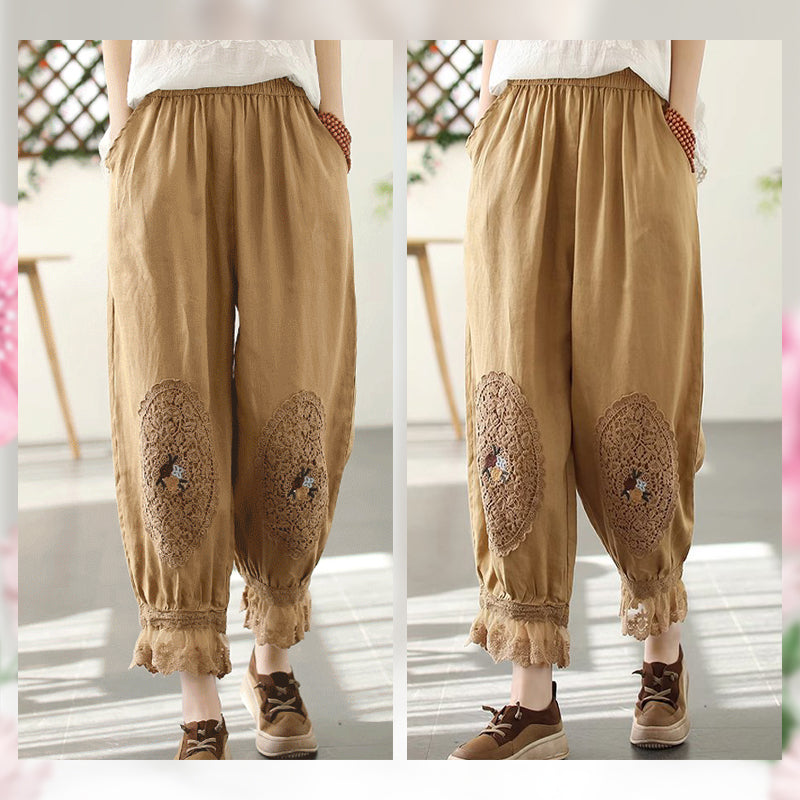 Te damskie koronkowe spodnie z lnu i bawełny z haftem mają wygodną trójwymiarową wersję oraz wysoki stan i kontrolę brzucha. Wyszczupla, ale nie obcisła, może napiąć brzuch i talię, ukrywając mały brzuszek, dzięki czemu nie musisz martwić się problemami z figurą.