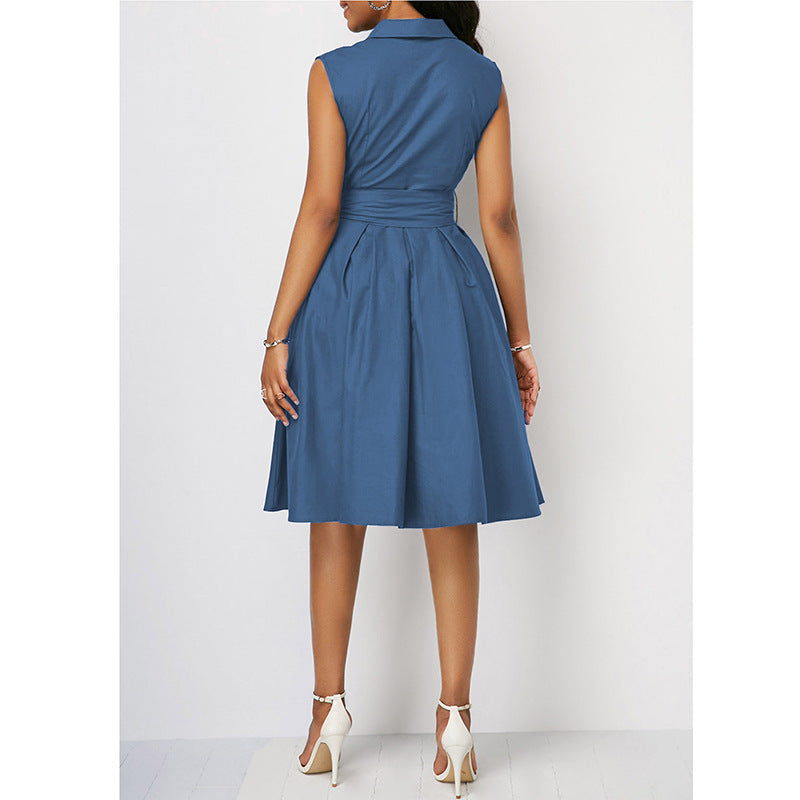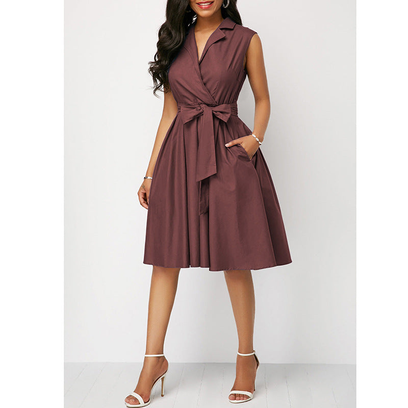 2023 w gorącym stylu jednokolorowa talia bez rękawów, kołnierzyk POLO z klapami i wiązaniem średniej długości sukienka dojeżdżająca do pracy