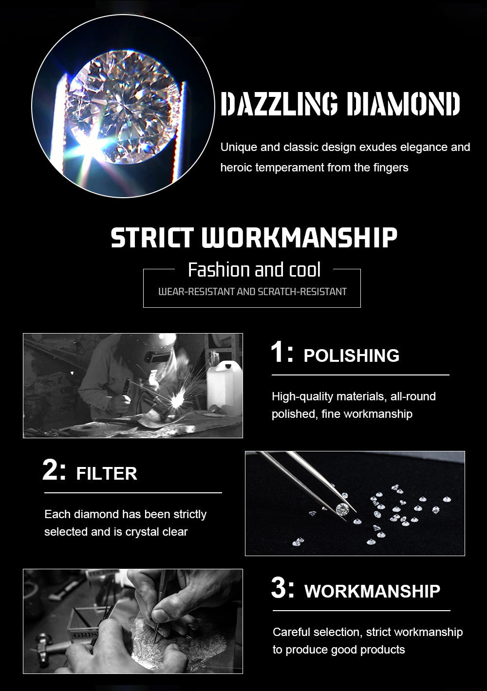 Wyselekcjonowane, wysokiej jakości sztuczne diamenty, każdy krystalicznie czysty; całkowicie wypolerowany, każdy błyszczy.