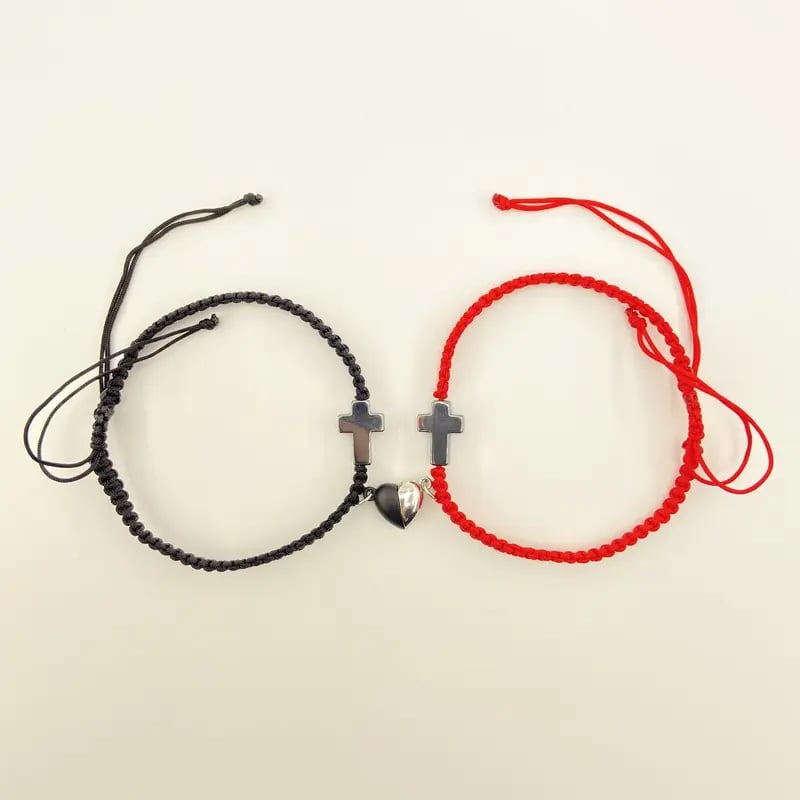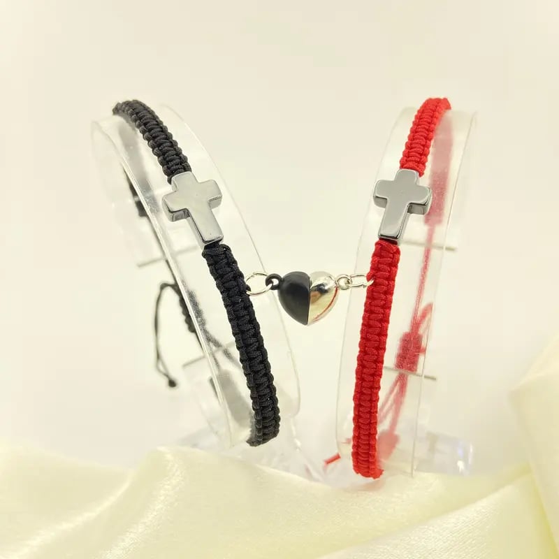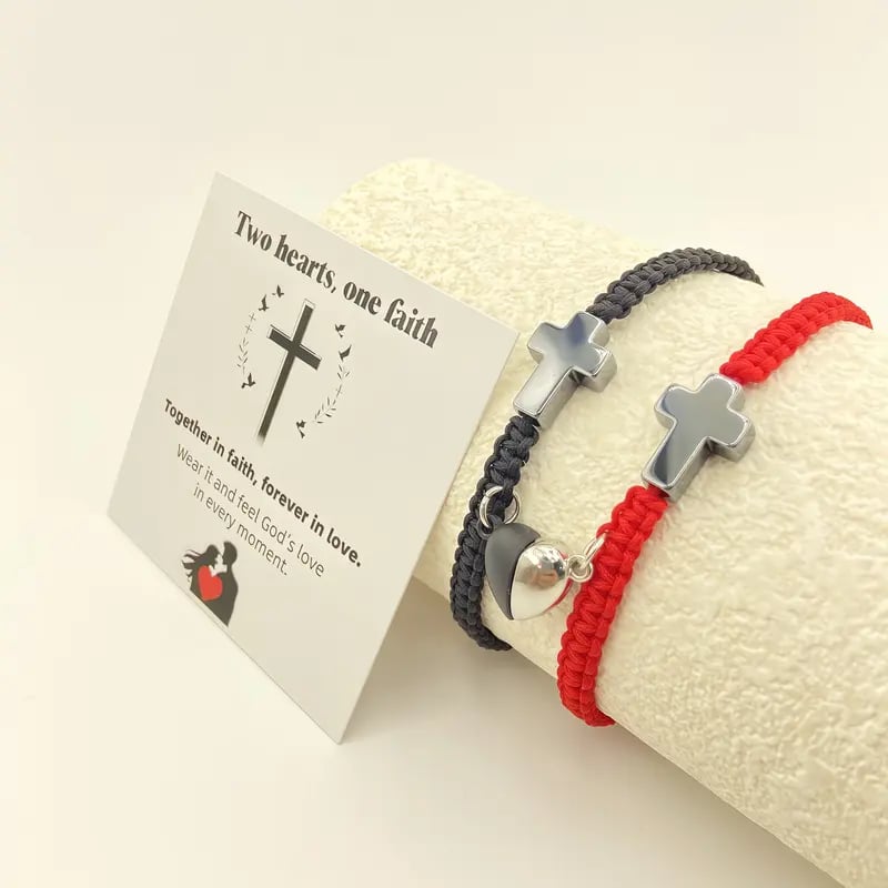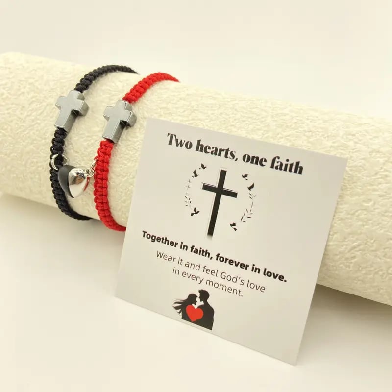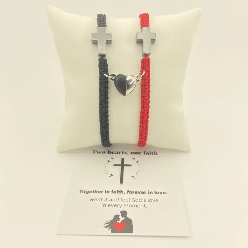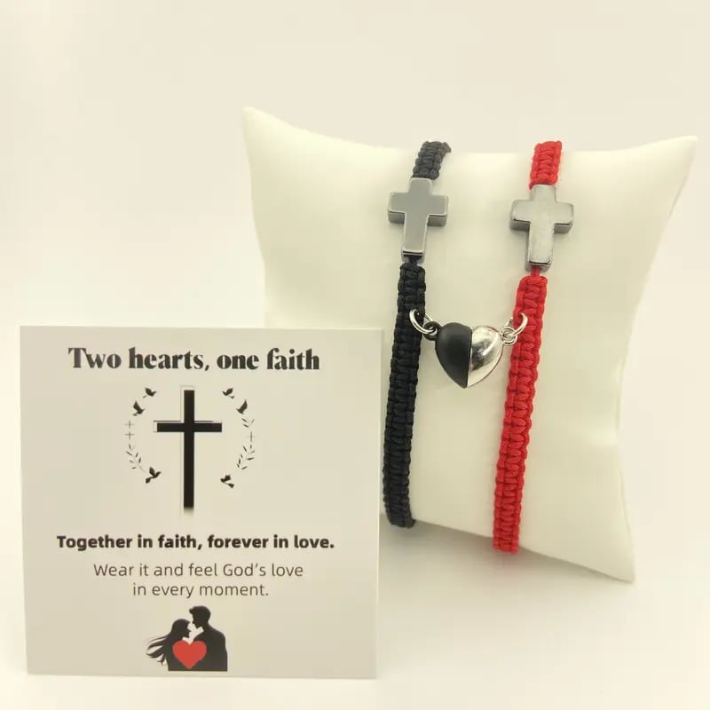 ✝️ Ten inspirujący zestaw bransoletek z krzyżem chrześcijańskim celebruje Waszą więź, czy to z partnerem, małżonkiem, czy kimś wyjątkowym. Przedstawia krzyż chrześcijański symbolizujący wiarę, nadzieję i miłość Jezusa. Magnetyczne elementy w kształcie serca symbolizują nierozerwalną więź między dwojgiem ludzi – razem w wierze, na zawsze w miłości.