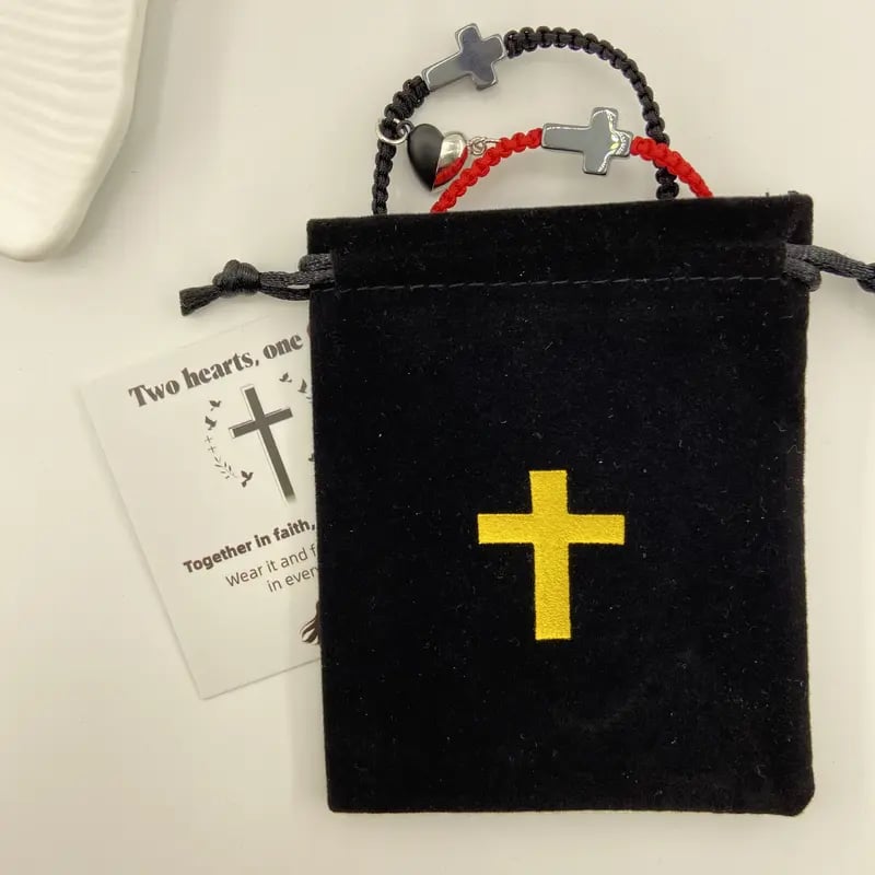 💕„Dwa serca, jedna wiara” – inspirująca chrześcijańska bransoletka z krzyżem i kartką z błogosławieństwem Jezusa