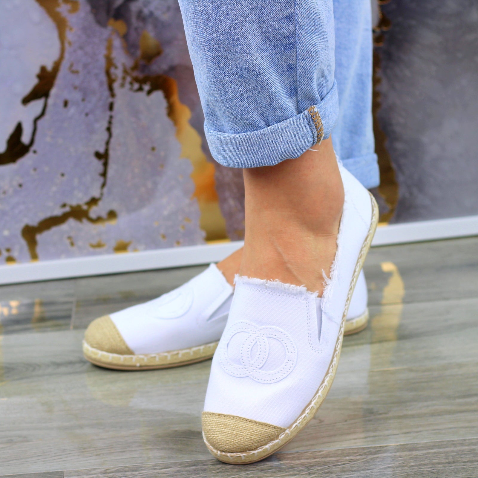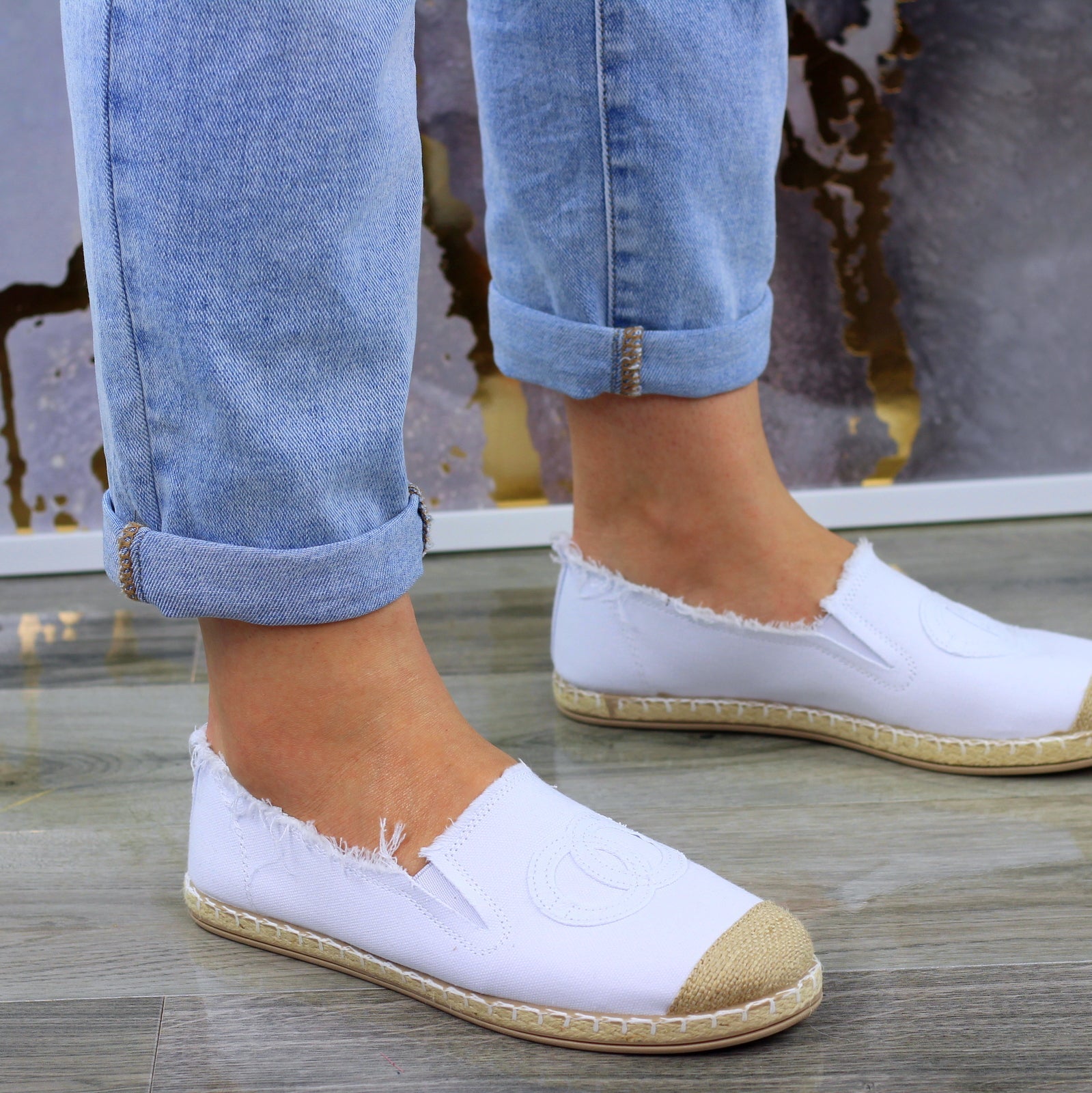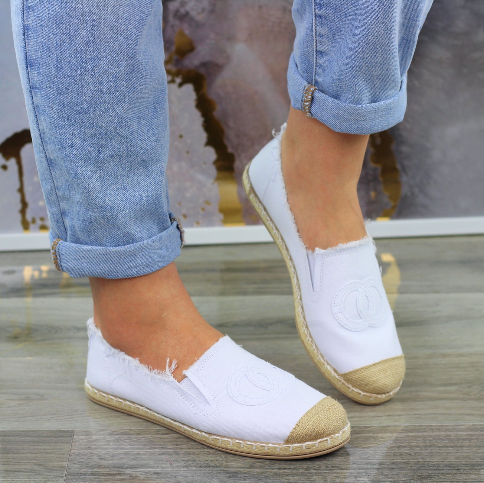 Białe płaskie espadryle damskie z logowaniem